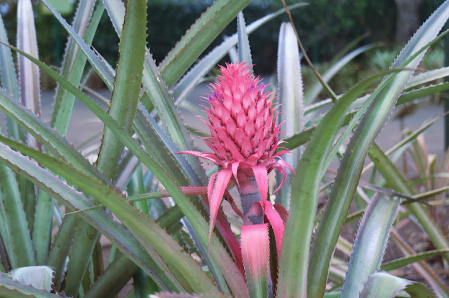 | Most of the pineapples I saw were pretty small. This is the best photo of a pineapple I got. I'm guessing it's an ornamental one because of the vibrant pink color. |